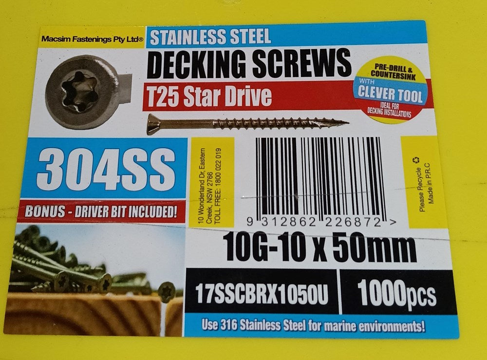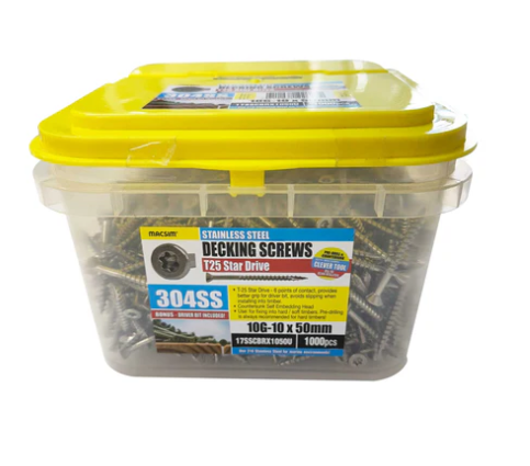 Decking Screws 10Gx50mm Stainless 304 T17 CSK Torx Drive- 1000 pc Bucket